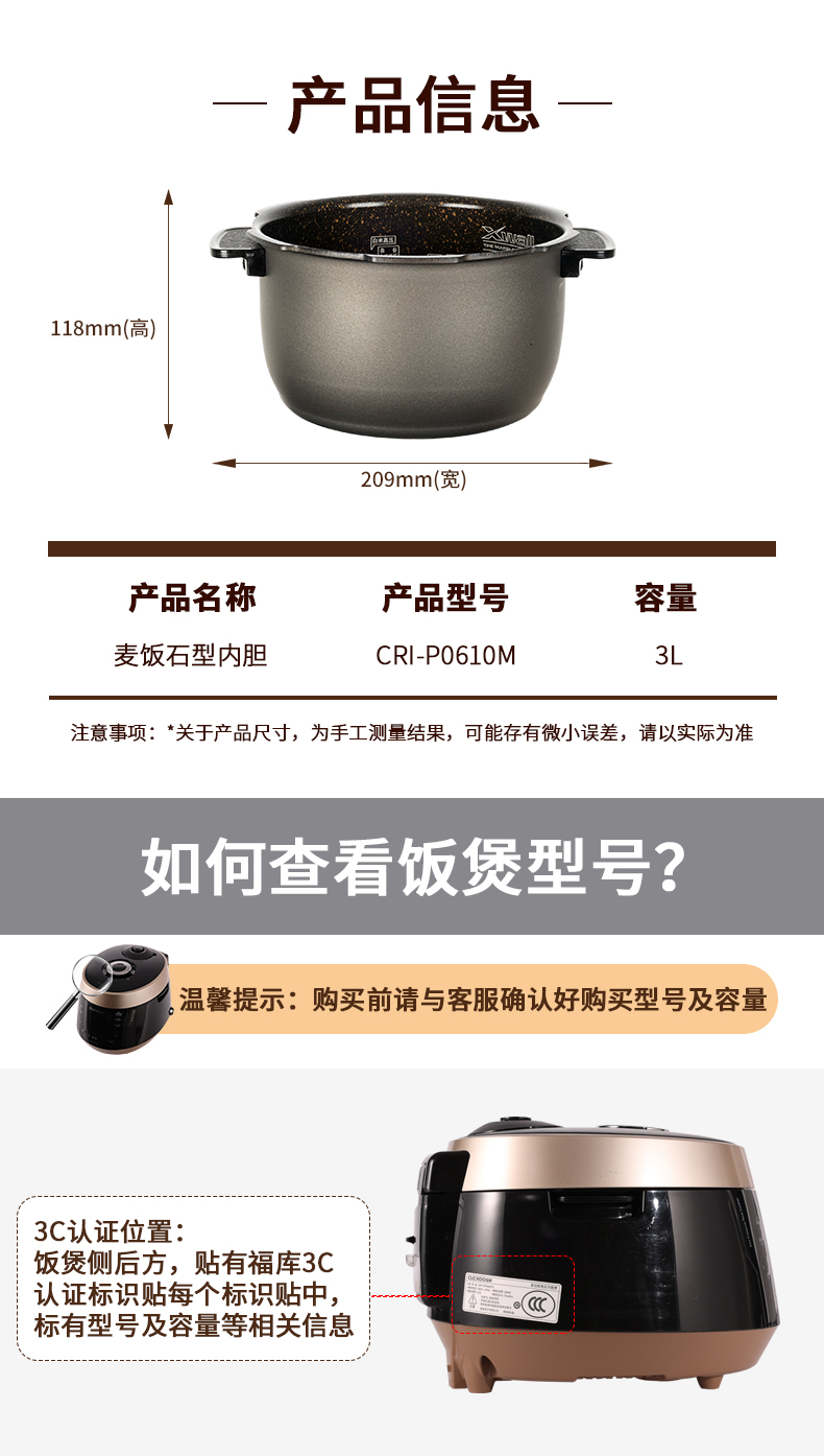 韩国CUCKOO/ CRI-P0610M 麦饭石型 3L专用内胆